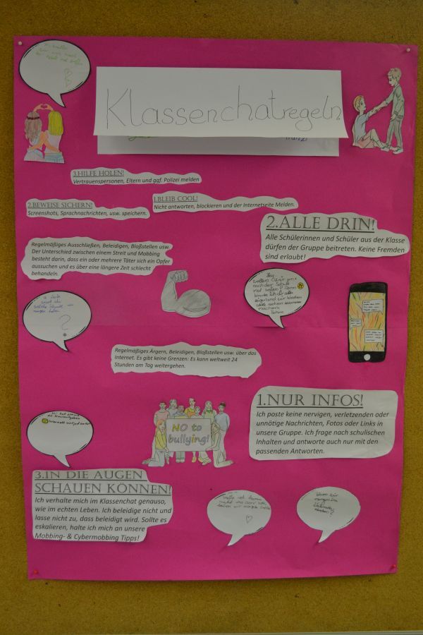 Nach der Begrüßung durch die pädagogische Koordinatorin Frau Kuhlmann hörten die Eltern einen Vortrag durch die Elternmedienlotsen, sahen Rollenspiele, hörten einen Rap und sahen sich die Ergebnisse der einzelnen Klassen wie Plakate oder Quizlet-Fragen an. Es ging intensiv um Konflikte, Mobbing, Cybermobbing und Regeln und Ratschläge - insbesondere im Umgang mit Whatsapp.