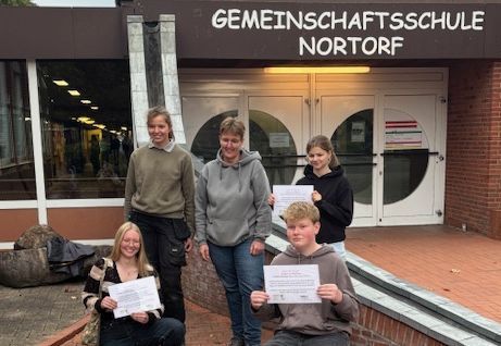Auf der Ausbildungsmesse wurde neben vielen anderen tollen Mitmachaktionen auch ein Wettbewerb durchgeführt, wer am schnellsten ein Kabel auf die Kabeltrommel aufrollen kann. Auch der Bürgermeister Herr Ackermann beteiligte sich und legte mit 21,5 sec eine sehr gute Zeit vor. Diese wurde nur einmal geschlagen von Ben (8. Jg) mit 21 sec. Weitere schnelle Aufrollerinnen waren Leandra (13. Jg) mit 22 sec und Joulie (8. Jg.) mit 24 sec. Alle drei Schüler*innen gewannen jeweils einen Gutschein über 20 € bei „Moin Moin“ von der Firma A. Struck aus Bargstedt. Herr Ackermann war ebenfalls bei der Preisübergabe zugegen und bekam einen Trostpreis überreicht.