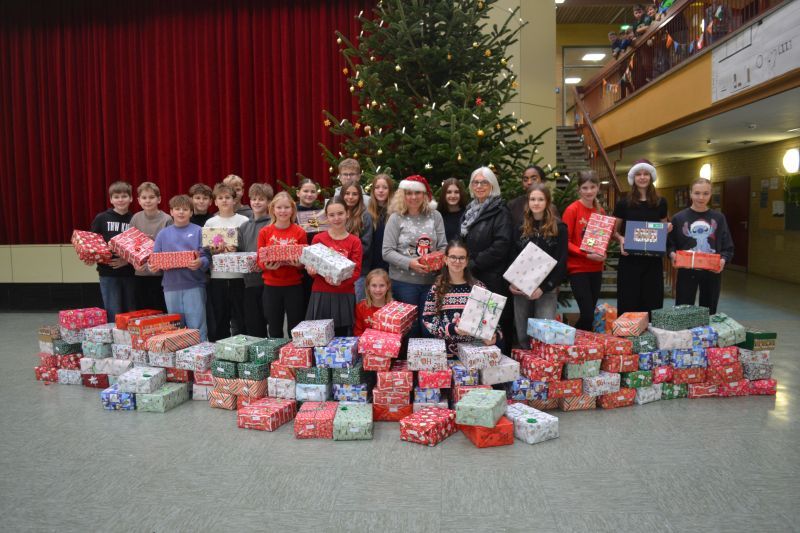 Aus über 130 Schuhkartons machte die Klasse 7a mit ihrer Klassenlehrerin Frau Pufahl Geschenke für die Nortorfer Tafel. So kann die Nortorfer Tafel die hübschen Päckchen mit Kaffee, Tee, Spiezeug, Süßigkeiten und vielem mehr an Bedürftige ausgeben. Dabei halfen die Schülerinnen und Schüler der 7a gern.