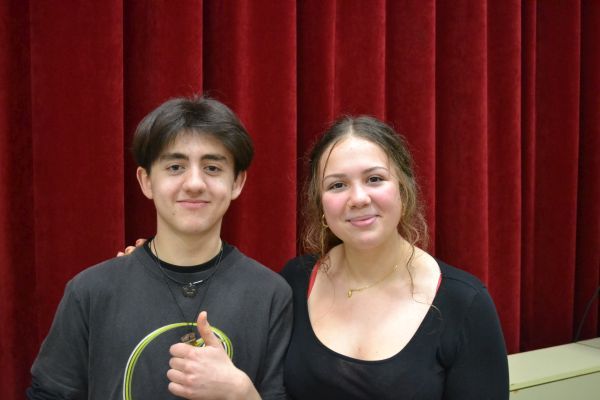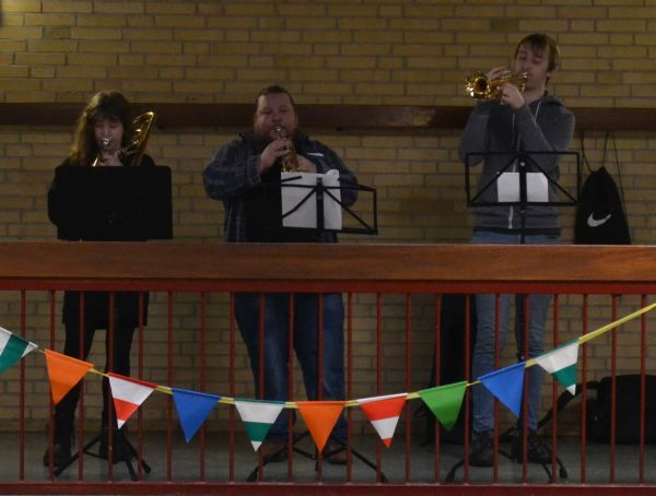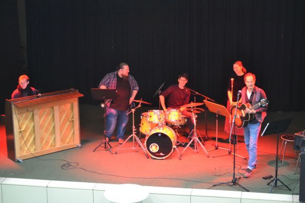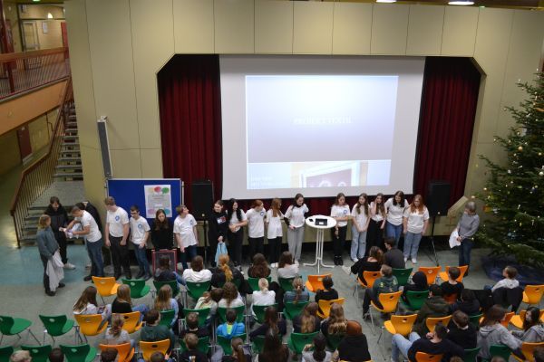 Durch das Programm führte wieder unser Schülersprecher-Team Sophie und Watomi. Neben Vorstellung einer Klassenfahrt, einem Bericht zum Polenaustausch, einer Info zur Social-Media-Sprechstunden und der Vorstellung der selbst bedruckten T-Shirts durch die 8f gab es Songs der Lehrerband und weihnachtliche Blasmusik - zum Mitsingen :-)